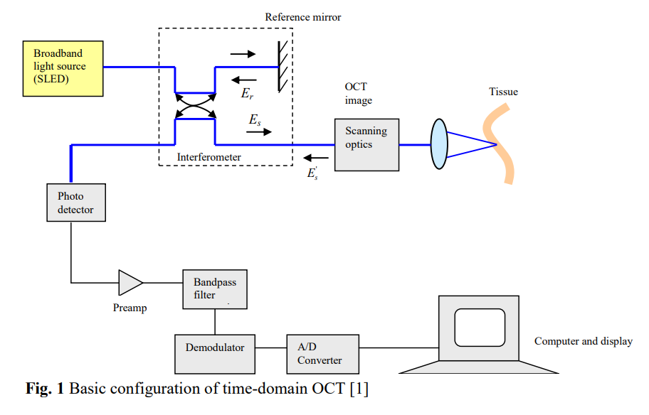 Basic configuration of time–domain OCT system is shown in Fig. 1 [1]. Light in an OCT system is broken into two arms—a sample arm (containing the item of interest) and a reference arm (usually a mirror). The combination of reflected light from the sample arm and reference light from the reference arm gives rise to an interference pattern, but only if light from both arms have travelled the “same” optical distance (“same” meaning a difference of less than a coherence length). By scanning the mirror in the reference arm, a reflectivity profile of the sample can be obtained.