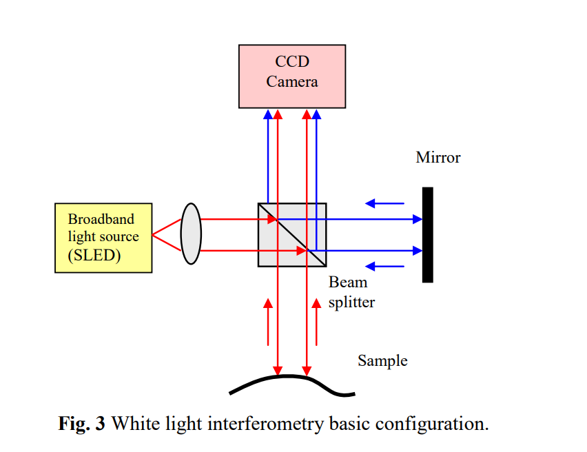 White light interferometry is to capture intensity data at a series of positions along the vertical axis where the surface is located by using the shape of the white-light interferogram, the localized phase of the interferogram, or a combination of both shape and phase. An example of the operation principle is illustrated in Fig. 3. The light of a broadband light source (SLD) with short coherence length is split into two beams: an object beam and a reference beam. The object beam reflects from the object (sample), and the reference beam reflects off of a reference mirror. The two reflected beams are captured and recombined at the beam splitter. The superimposed beams are imaged by a CCD camera for processing. If the optical path for an object point in the measurement arm is the same as the optical path in the refrence arm, there is constructive interference, which results in a high intensity in the camera pixel of the respective object point, for all wavelengths in the spectrum of the SLD. For object points having a different optical path, the interference is destructive, which results in a much lower intensity. In this way, the topolographical structure of the sample is converted to light intensity difference, and, therefore, to the CCD output signals, which are compiled and analyzed.